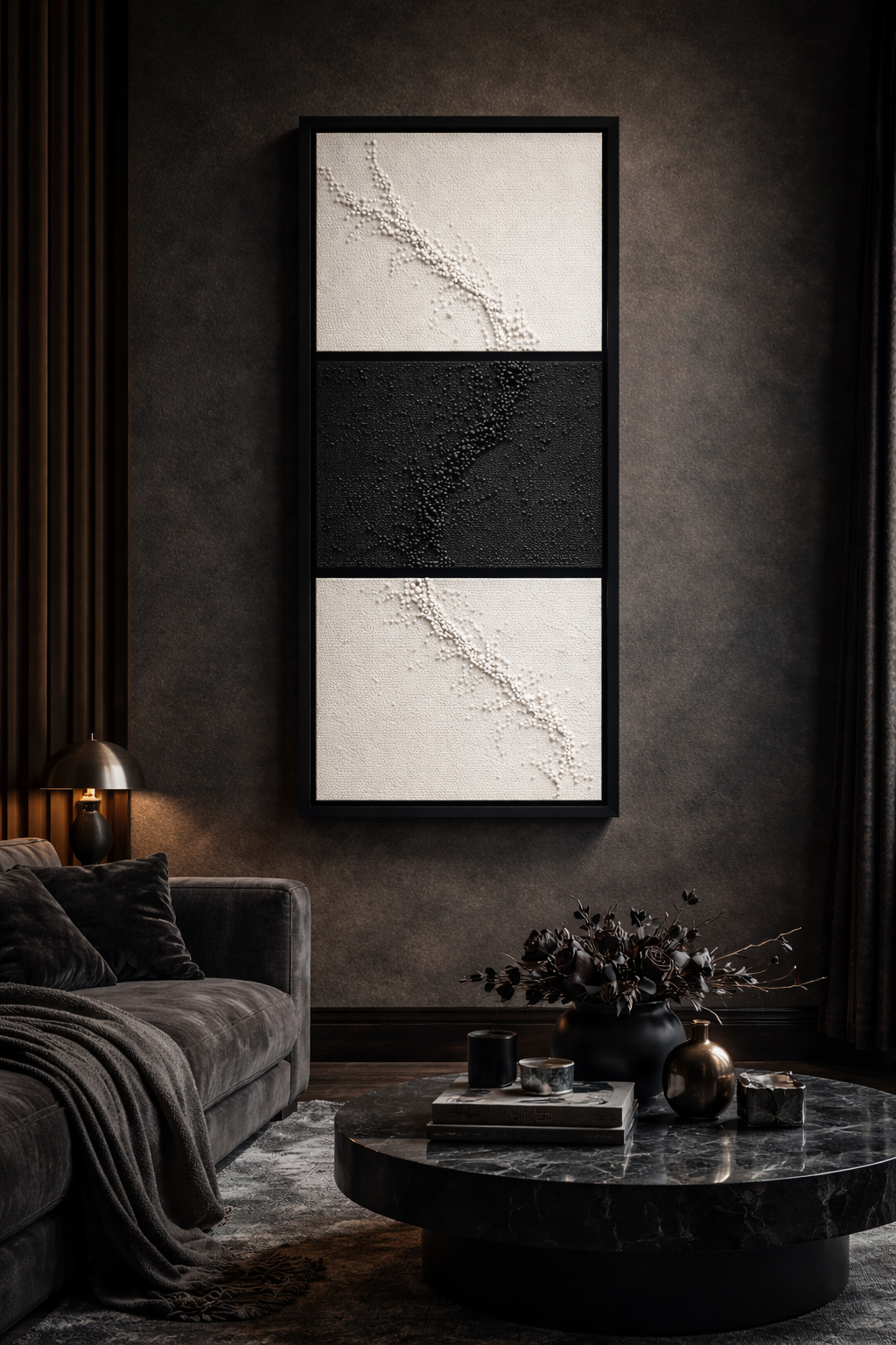 The contrast between off-white and black is deliberate, not decorative. It speaks to balance, tension, and the spaces in between. Designed to live in grand architectural settings, Continuum holds its own against scale. It does not compete with the room. It completes it.