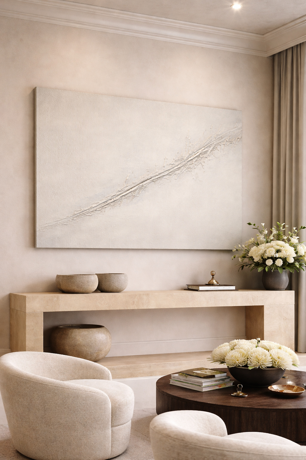 Traverse is a large-scale original work designed to sit quietly within a space while still holding presence. A subtle diagonal form moves across a soft, stone-toned surface, creating a sense of balance, transition, and restraint.